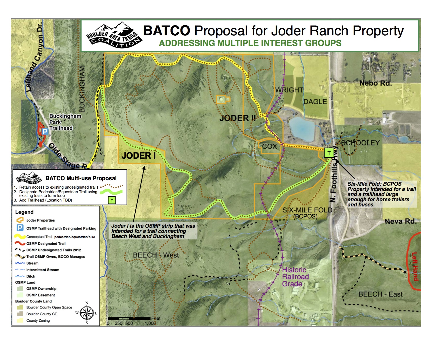 The Boulder Area Trails Coalition (BATCO) supports a more equitable outcome for public access to the Joder Arabian Ranch than the proposal put forth by Staff at the November 12,2014, OSBT meeting. We were pleased to note that the Open Space Board of Trustees (OSBT) directed Staff to come back to them with more options for trails utilizing existing trails and parking facilities for discussion at the December 10 OSBT meeting.